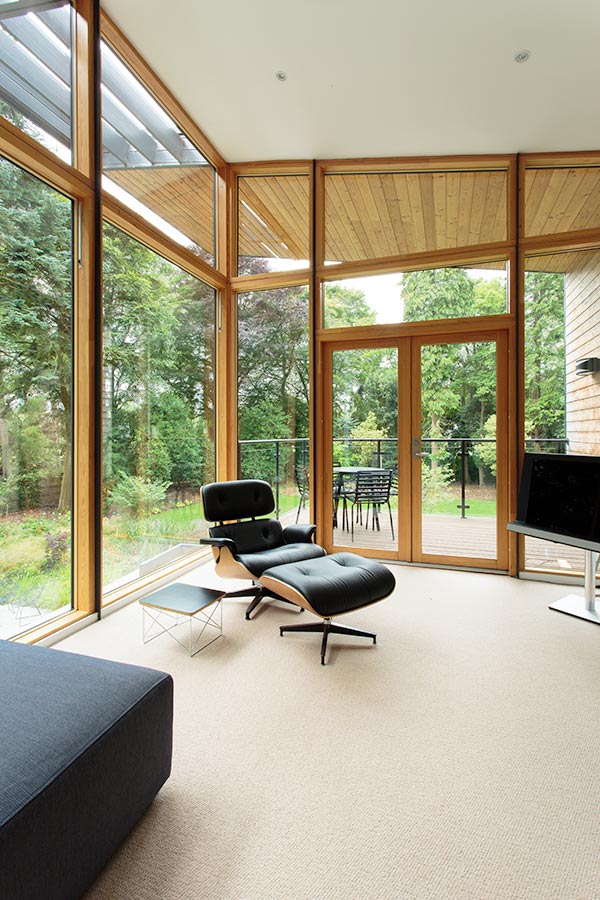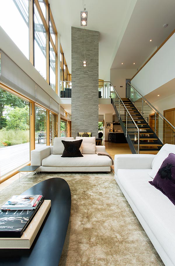 At the heart of the living space, a glass and timber staircase rises up to a high gallery. Rising with the staircase and echoing the trees outside, the slate-clad chimney breast has a hearth open to both living and dining areas.